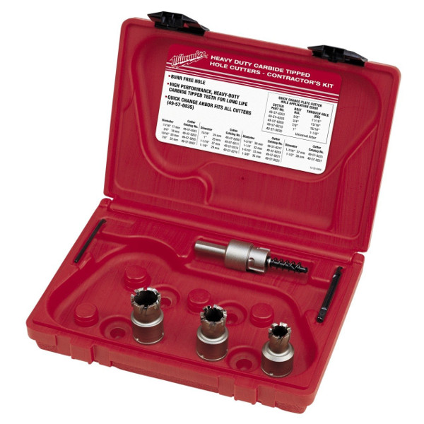 For materials up to 1/2 in. these carbide tipped steel plate cutters produce fine, burr-free holes in a variety of materials. They are ideal for stainless steel, structural steel studs and electrical boxes. They can also improve your production in cast iron, brass, aluminum and other thin non-ferrous metals. The carbide tips stay sharper longer than high-speed steel or bi-metal cutters giving these cutters longer life. Lubrication during drilling extends the life of the carbide cutter. Milwaukee recommends the use of Hawg Wash cutting fluid for best results. Hawg Wash fluid is available in 16 ounce bottles (49-32-0081). One bottle makes one gallon of lubricating solution. Arbors 49-57-0035 or 49-57-0037 are needed for these cutters.