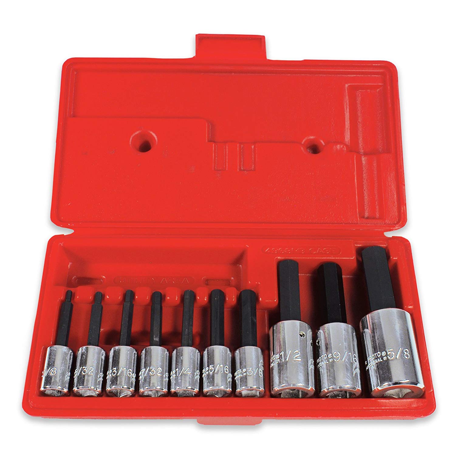 Stanley J4900A Proto 3/8-inch & 1/2-inch Drive 10 Piece Hex Bit Set includes blow molded box. Proto bits are offered in a broad range to accommodate production assembly applications. Made of alloy steel. Polished chrome finish. Proto 3/8" & 1/2" Drive 10 Piece Hex Bit Set in Blow Mold Includes the following items: J49901/8, J49905/32, J49903/16, J49907/32, J49901/4, J49905/16, J49903/8, J54411/2, J54419/16, J54415/8, J4968PB.