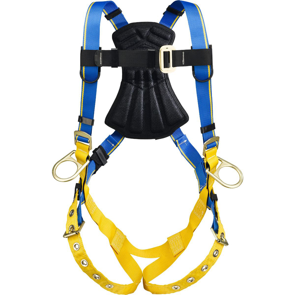 Werner Blue Armor 1000 harnesses deliver the right combination of safety features, comfort, and durability for the professional worker. Unique wear indicating webbing and impact indicators allow for easy inspection. They feature 5-point adjustments for optimal fit, lightweight hardware and pads, and bright colors for worker visibility on the jobsite. The back pad is large enough to protect the user's back, padded to absorb sweat and feel comfortable, and designed to prevent tangling when donning the harness. The rear dorsal D-ring is made from high quality forged alloy steel for strength and durability. Hip D-rings for positioning applications. Slotted pass-through buckle on the chest strap and tongue buckle leg straps are simple, fast, easy, and ideal when more than one worker could use the same harness.