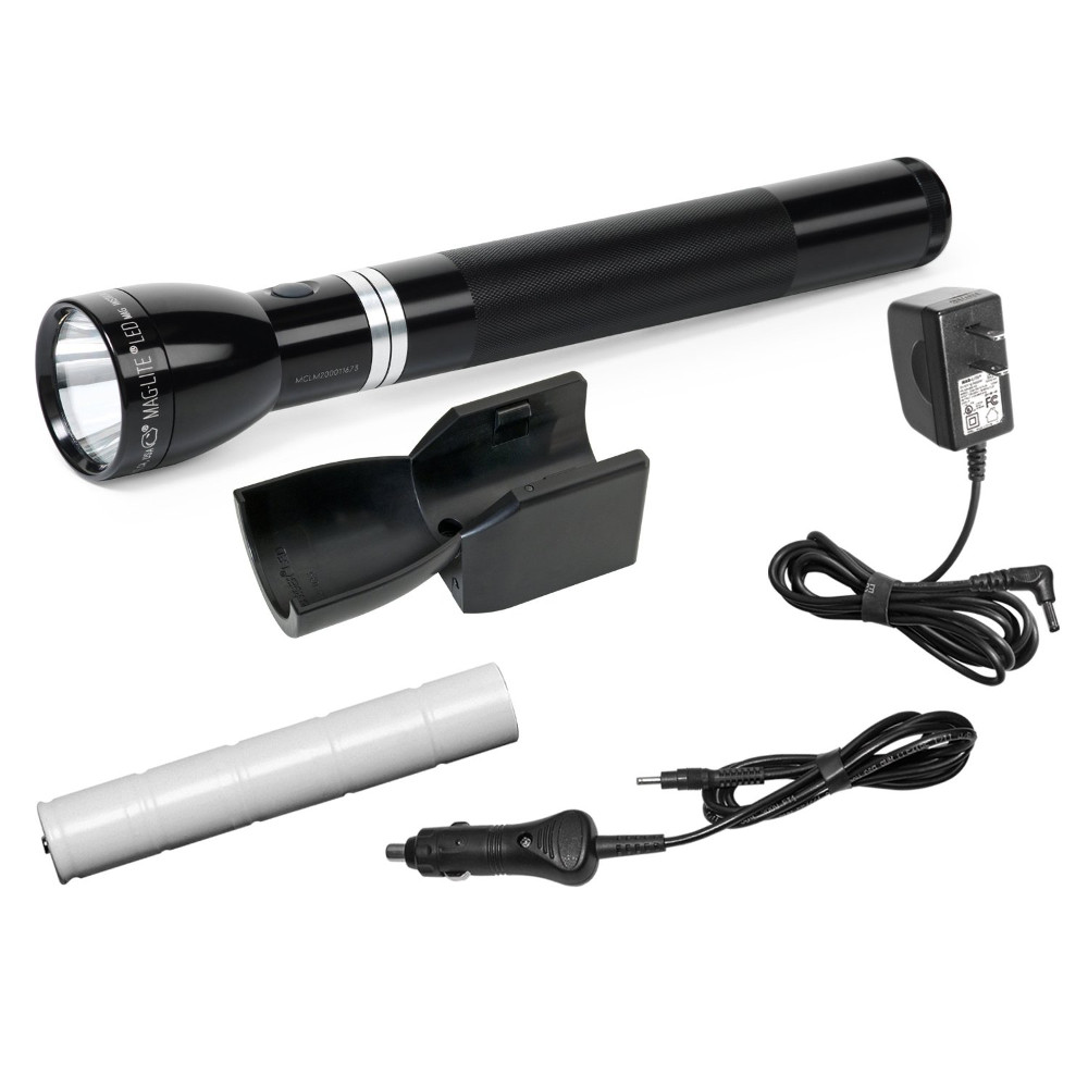 - System includes a 12" aluminum LED flashlight, charging cradle, and 12V and 110V charging adaptors.
