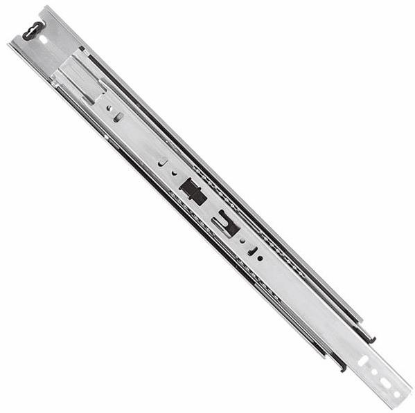 Ball-bearing, full-extension drawer slide, non-handed design. Standard 1/2" side clearance. Lever disconnect for easy drawer removal and a positive stop bumper which provides an anti-rebound feature.