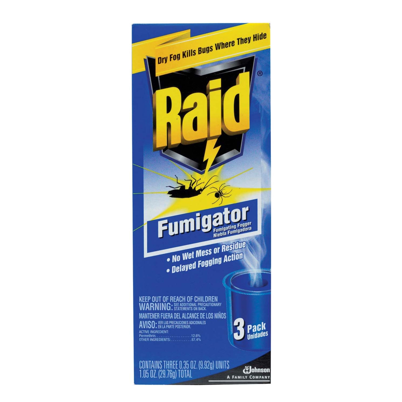 Raid Fumigator creates a deep-penetrating fog that flushes bugs out from where they hide and kills them on contact.
